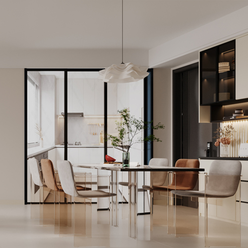 现代极简风格的硬装造型简单,没有复杂多余的装饰,家居物品以不占面积、实用为主,整体看起来简洁大气。在空间布局上,现代极简风格讲究内外通透,追求不受实体墙限制的自由,常使用开放式设计或透明玻璃隔断。家具造型多采用直线,利落流畅,且常使用具有光泽感的新型材料,显得美观大方。