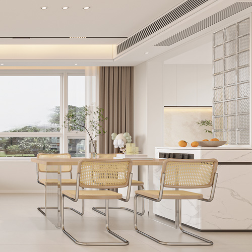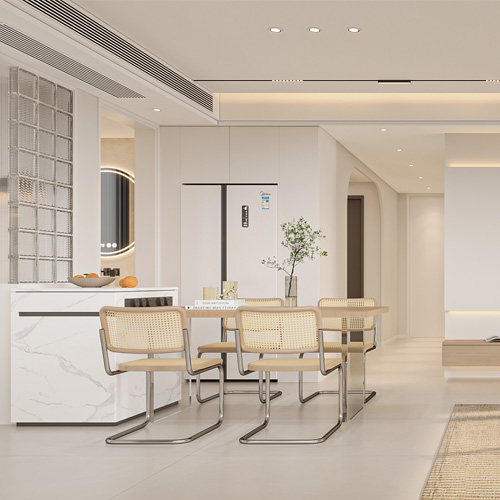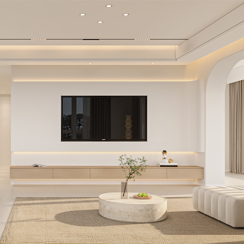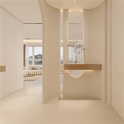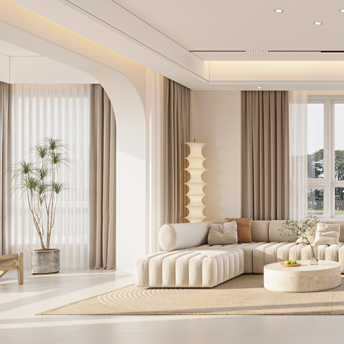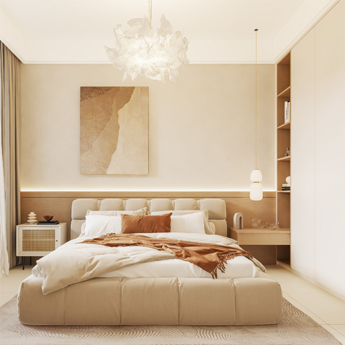 奶油风最直观也是最核心的特征在于:整体空间的硬装,简单干净直爽、软装却是温柔,质感细腻的高级感、软硬装相互协调,色调统一、造型和材